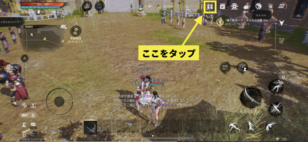 ブレイドアンドソウル2 (ブレソ2) 2023 8/26 チュートリアル完了の目安 所要時間:約8分 “アラン”というキャラクターとの戦闘終了後、以下の画面まできたらチュートリアル完了です! スクショする画面の開き方 STEP画面右上の「プレゼントアイコン」をタップ STEPこの画面をスクショしてください! 「受取り」をタップして報酬を受け取ってからスクショするようにしてください! 未分類