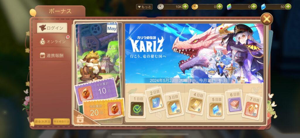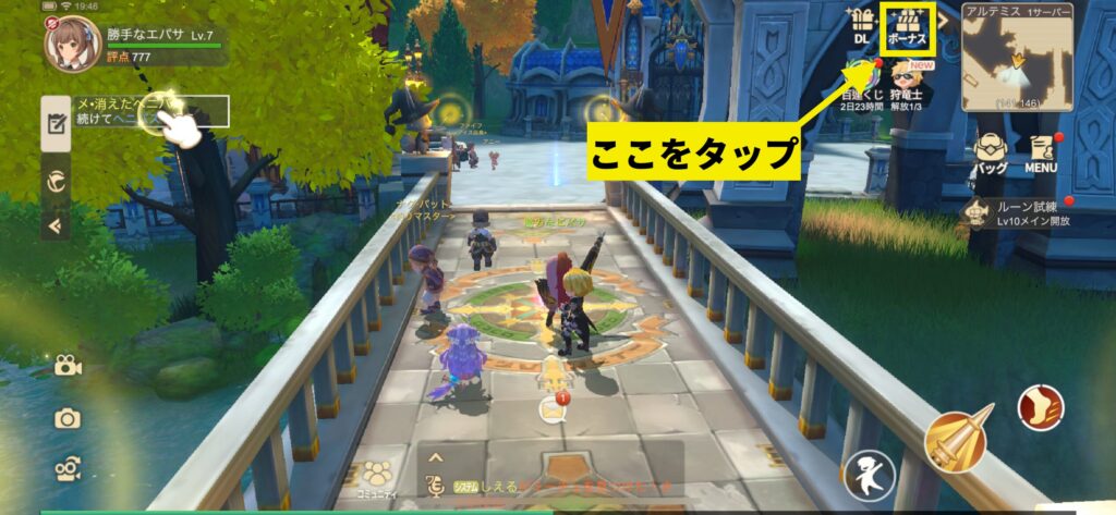 画面右上の「ボーナス」をタップ