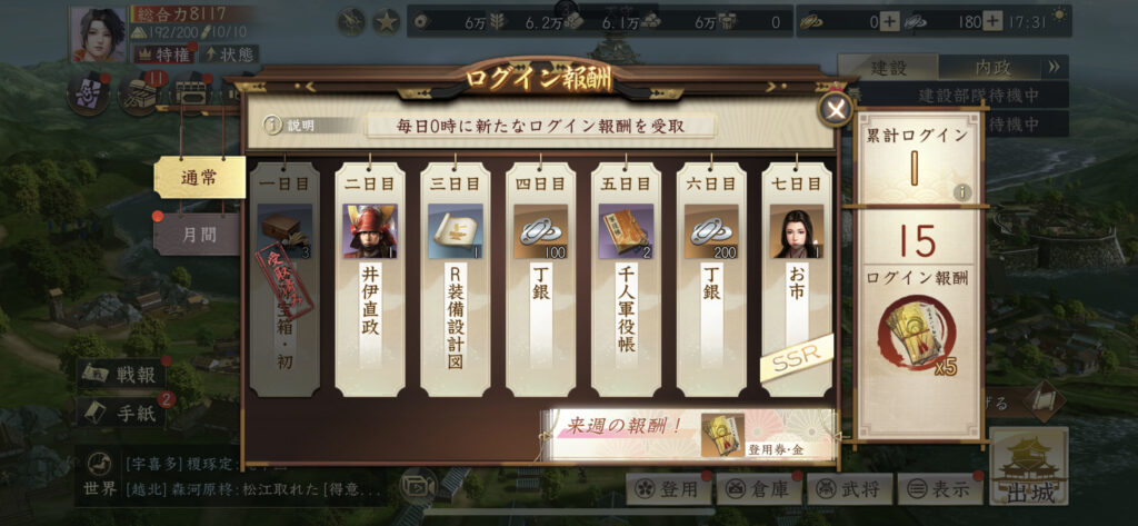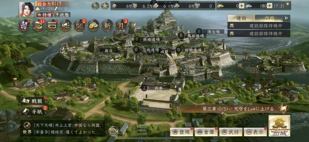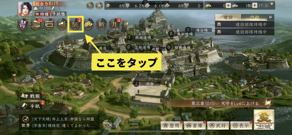 新信長の野望 2023 9/11 チュートリアル完了の目安 (所要時間:約5分) 第3章開始後、以下の画面まできたらチュートリアル完了です! スクショする画面の開き方 STEP画面上の右から4番目のアイコンをタップ STEPこの画面をスクショしてください! 報酬を受け取ってからスクショするようにしてください! 未分類