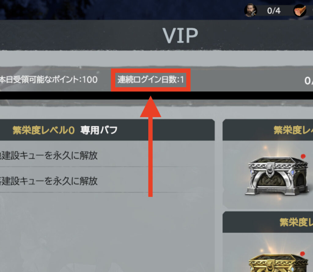 Viking Rise 2023 5/11 チュートリアル完了の目安 チャプター9をクリアした後、画面左上に盾のようなアイコンが表示されたらチュートリアル完了です! スクショする画面の開き方 STEP表示されたアイコンをタップ STEPこの画面をスクショしてください! 注意! 「連続ログイン日数」がカウントされているのを確認してからスクショしてください! 未分類